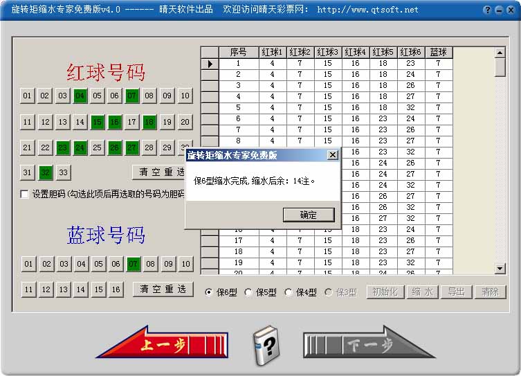 一款完全免费的彩票软件!用于福彩双色球,全国各种体彩或福彩选5型,选7型彩票的旋转矩阵缩水。其意义在于,如果你所选择的多个号码中包括了开奖的号码,那么你只要用很少的投入,就能够至少得到一个相应级别的保证。
